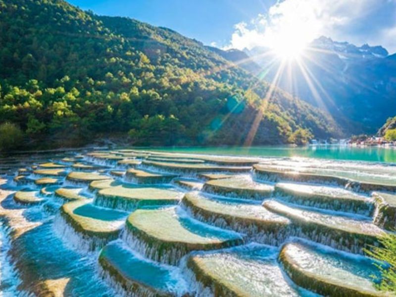 Thung lũng Lam Nguyệt (Blue Moon Valley) được ví như “dòng sông ánh sáng”, nơi hồ nước màu xanh ngọc chuyển sắc theo ánh trời. Dòng nước len lỏi qua các tầng đá vôi tròn bậc thang tạo nên chuyển động “Thủy khí liên tục” – biểu tượng của dòng tài lộc bất tận, sự sống luân hồi không ngừng.